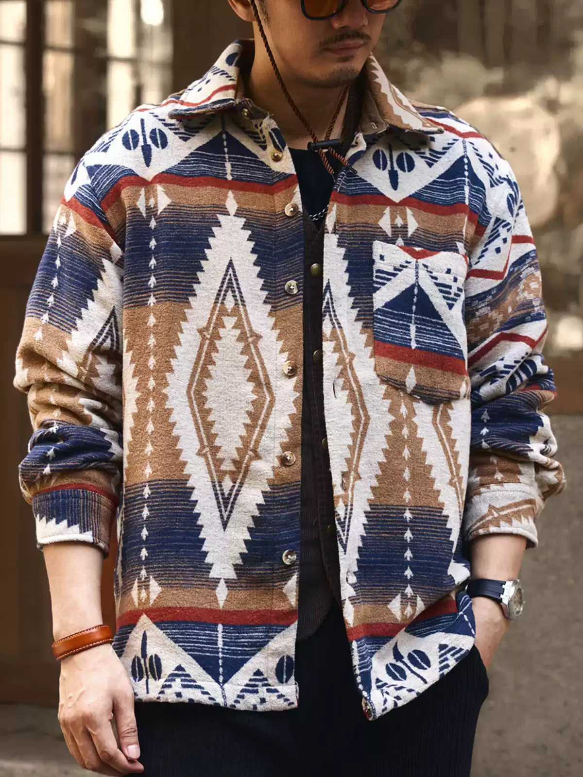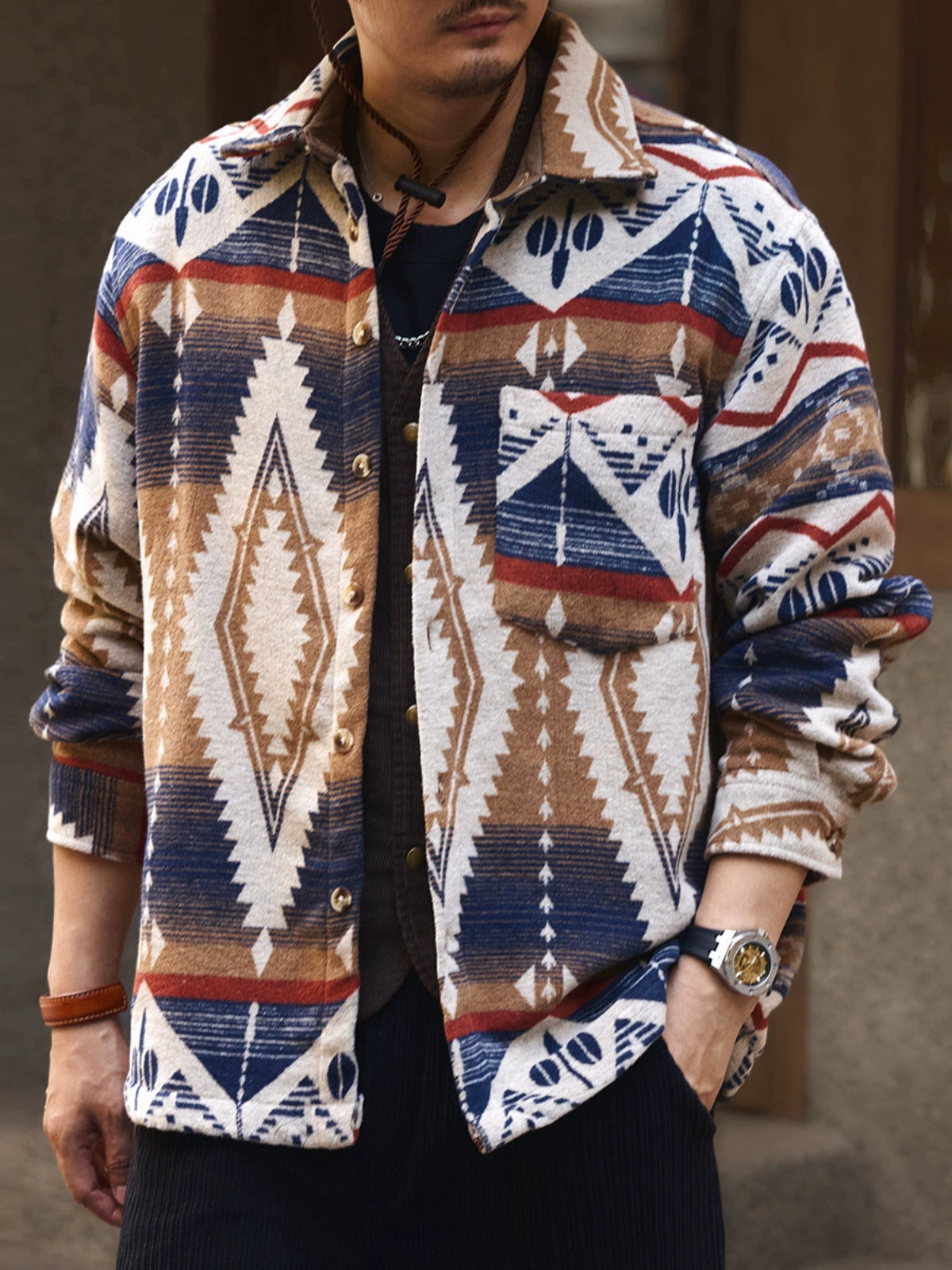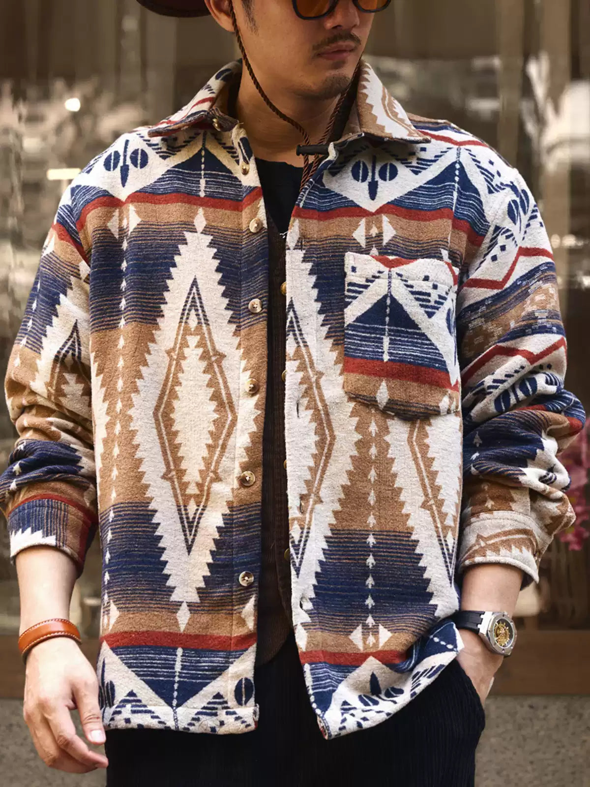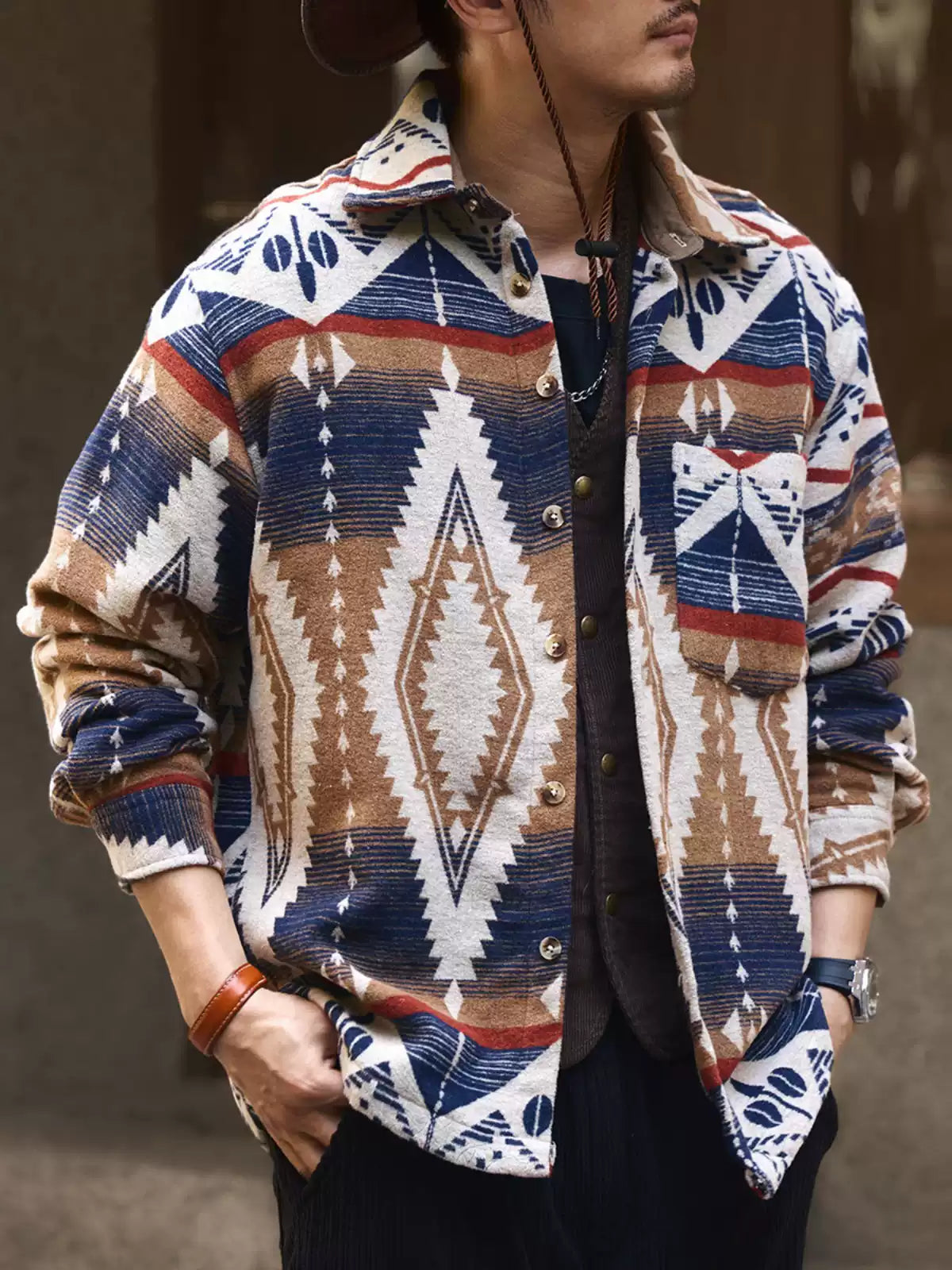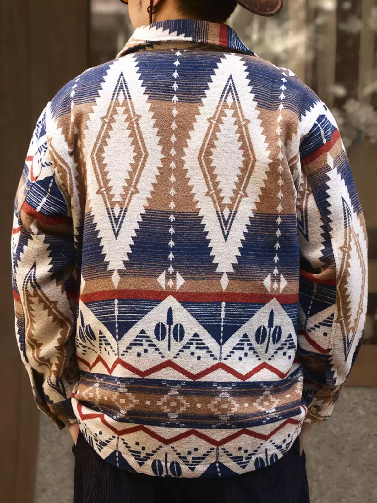 Ethnic Color-Woven Imitation Wool Long Sleeve Shirt Jacket